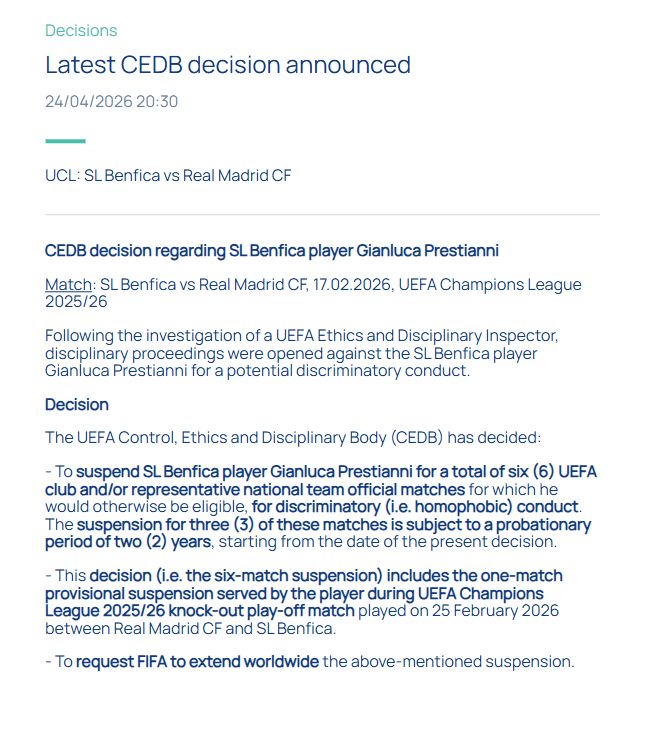 北京时间4月24日晚,欧足联官方发布公告,20岁的本菲卡前锋普雷斯蒂安尼因为涉嫌潜在的歧视行为,将被禁赛6场,其中3场缓期执行,同时1场临时禁赛已执行,欧足联还正式致函国际足联,申请将本次禁赛处罚,在全球范围通用执行。