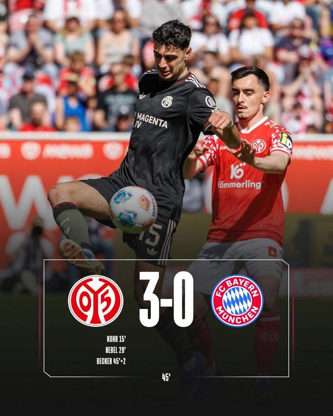 此役客场对阵美因茨,上半场战罢,拜仁0-3落后。